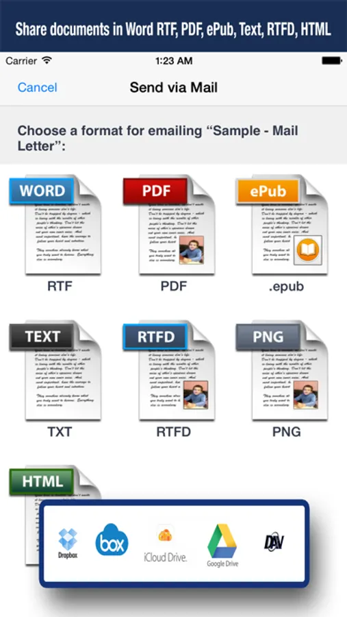 + Export and share your text documents to PDF, RTF, RTFD, ePUB, PNG, TXT, Markdown or HTML