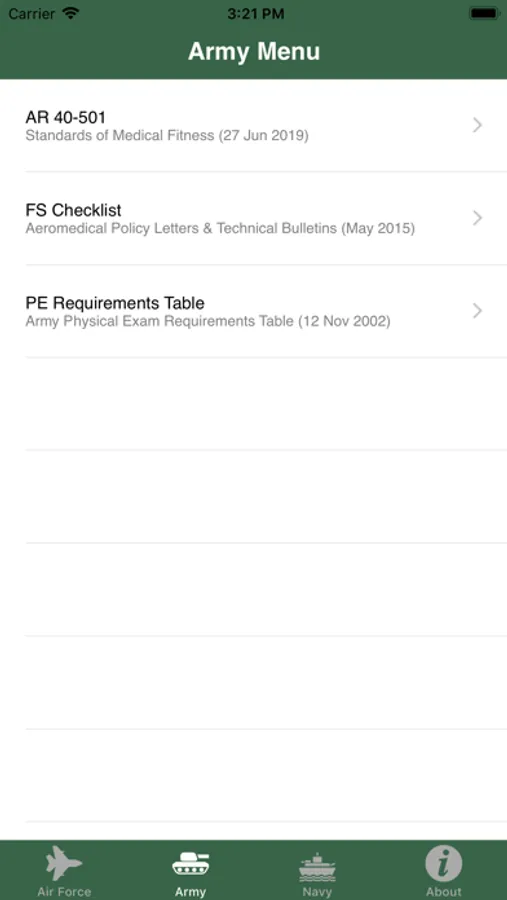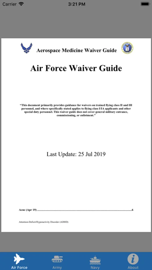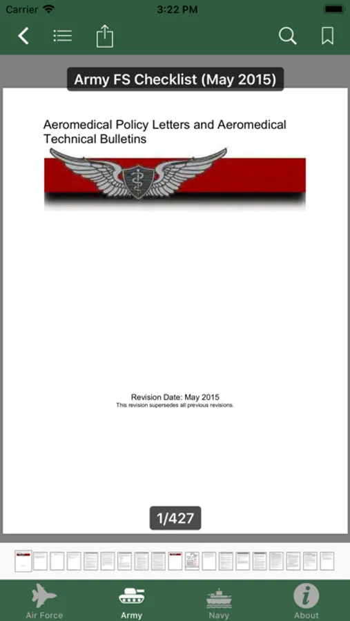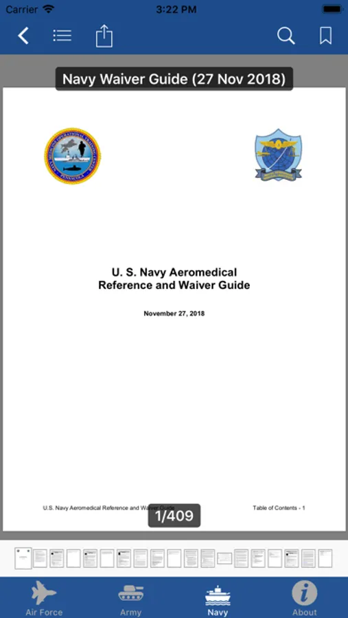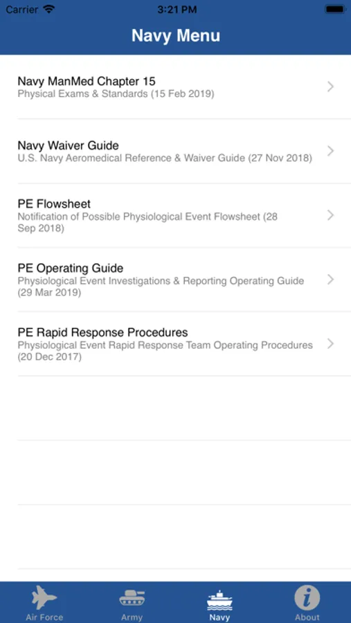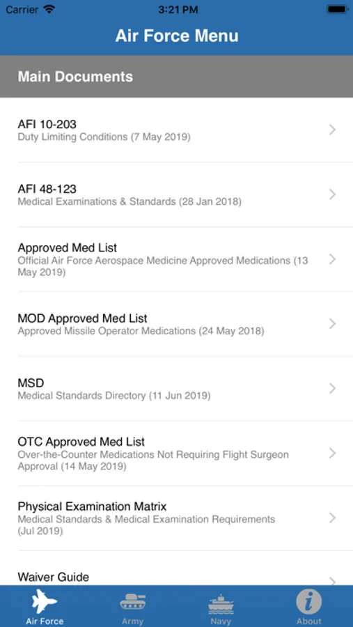 This application presents the medical standards for special duty personnel of the United States Air Force, Army, and Navy as well as other useful tools and information for Aerospace Medicine professionals.