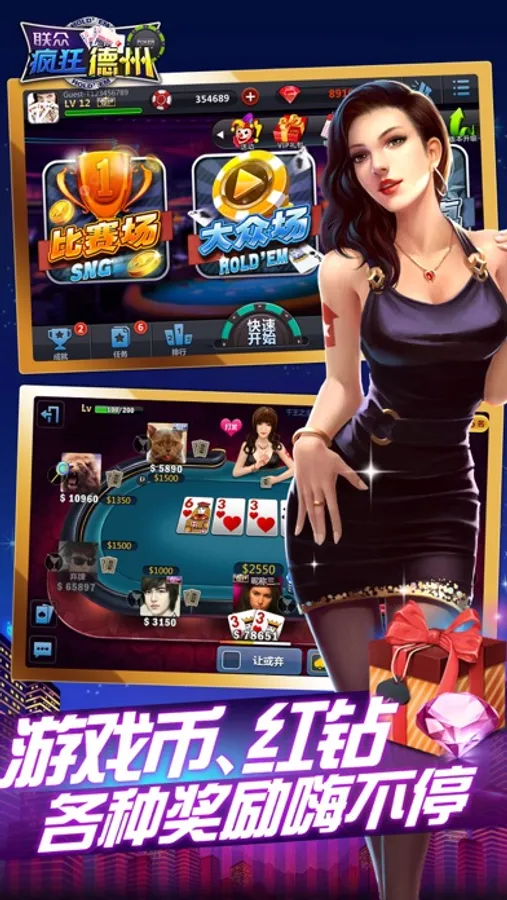 《联众疯狂德州》是联众游戏2015年强力推出的全新移动端德州扑克游戏。本款游戏界面精美、上手迅速、竞技与娱乐并重。打牌过程中玩家需斗智斗勇,最后的河牌往往就变成了你的救命稻草!马上加入对局,谱写属于自己的德州传奇吧!