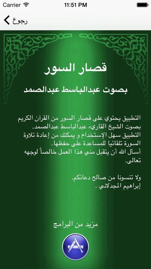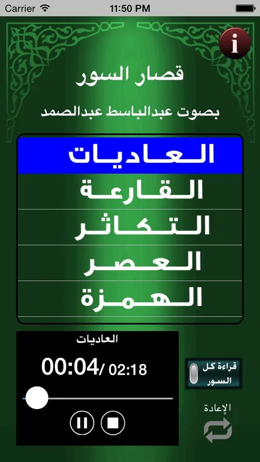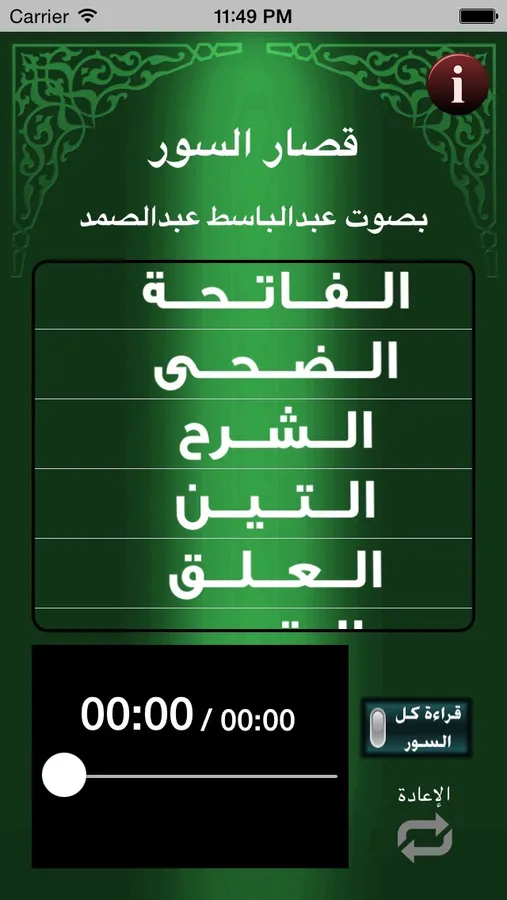 التطبيق يحتوي على قصار السور من القرآن الكريم. بصوت الشيخ القاريء عبدالباسط عبدالصمد.