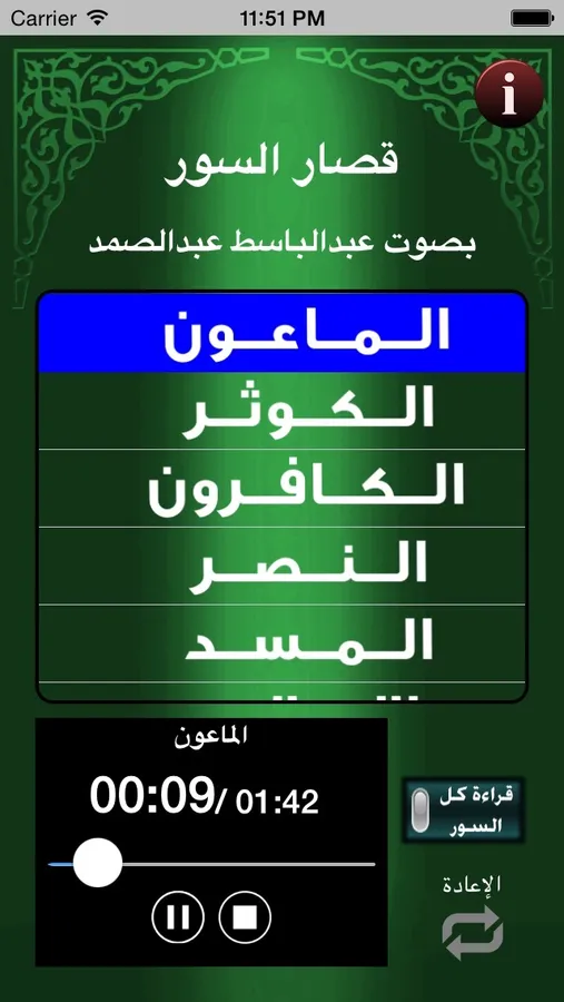 التطبيق سهل الإستخدام و يمكنك من إعادة تلاوة السورة تلقائيا للمساعدة على حفظها.