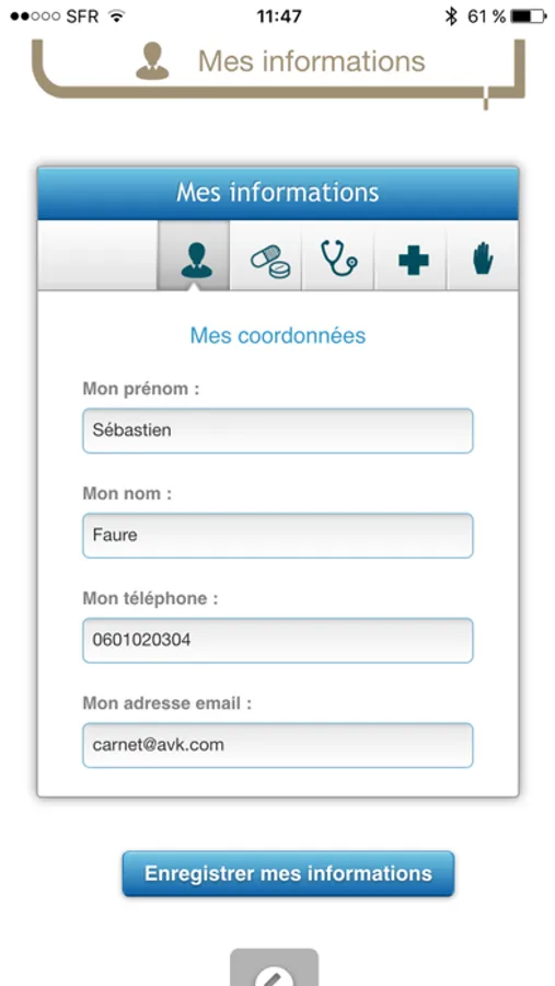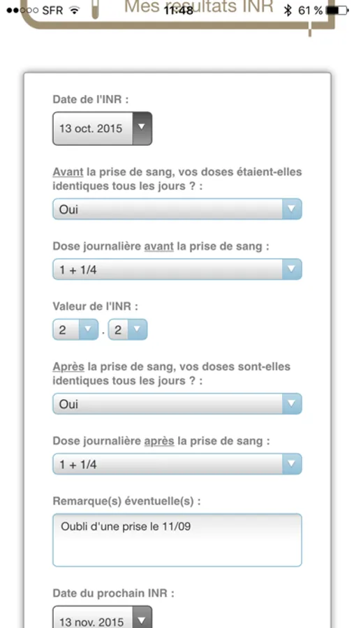 ”Mon carnet AVK” s’adresse aux personnes traitées par des médicaments anticoagulants de type antivitamine K (AVK) afin de les aider à suivre leur traitement. Cette application épurée et intuitive présente l’avantage de conserver une trace numérisée (tableau et graphique) des résultats de suivi biologique (INR) en fonction de doses de médicaments qui sont pris, permettant de mieux comprendre les évolutions de l’efficacité du médicament. ”Mon carnet AVK” possède aussi une fonction permettant de rappeler dans l’agenda les dates auxquelles les examens de laboratoire (INR) doivent être réalisés ainsi que les prises quotidiennes de médicaments (avec les doses correspondantes). Cette application a aussi pour objectif de renforcer autour d’elle la coopération entre professionnels de santé (médecins, pharmaciens, infirmières, biologistes) qui accompagnent les personnes traitées par des AVK.