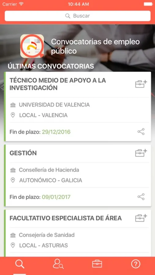 Los resultados de cada búsqueda se muestran de tal forma que en un solo vistazo se obtienen los datos básicos de la convocatoria: título, el órgano convocante, ámbito geográfico de los puestos ofertados, y la fecha fin de plazo. La barra lateral verde/roja indica si la convocatoria está con plazo de inscripción abierto/cerrado.