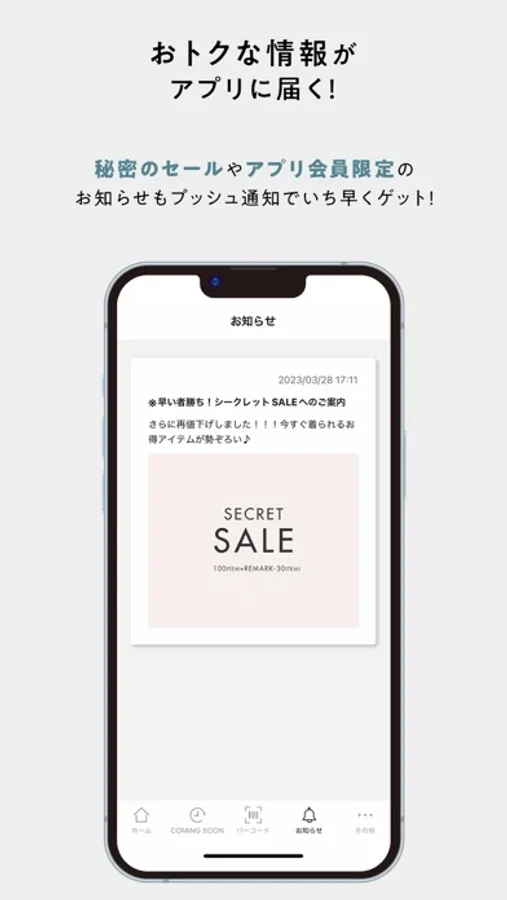 お得な情報をプッシュ通知でお知らせします。アプリの初回起動時にプッシュ通知を「ON」に設定するようお願いします。なお、オン・オフの設定は後から変更もできます。