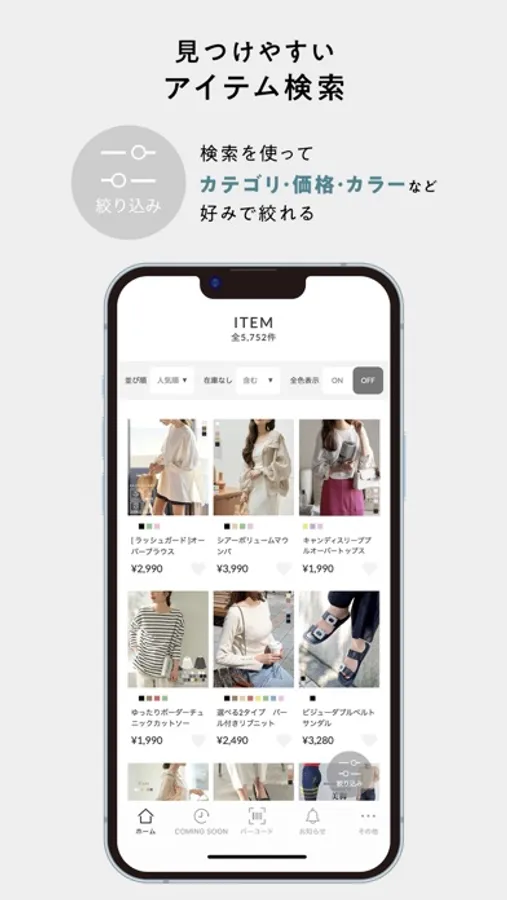 カテゴリ別・価格別・カラー別などお好みの検索方法でアイテムを探せます。