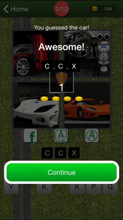 Guess 10 Cars correctly to unlock the next level. There are 12 levels to choose from, with a bonus Car every 8 hours. That's a total of 144 cars - some super, some not so super :)