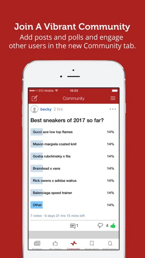 * Join the community and share your sneaker passion! Post stories or polls, comment on stories, share articles and videos, and tag articles!