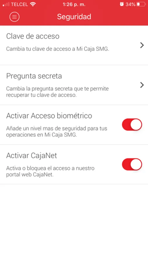 Cambiar contraseña de acceso, pregunta secreta, o activar el acceso biométrico y Caja Net.