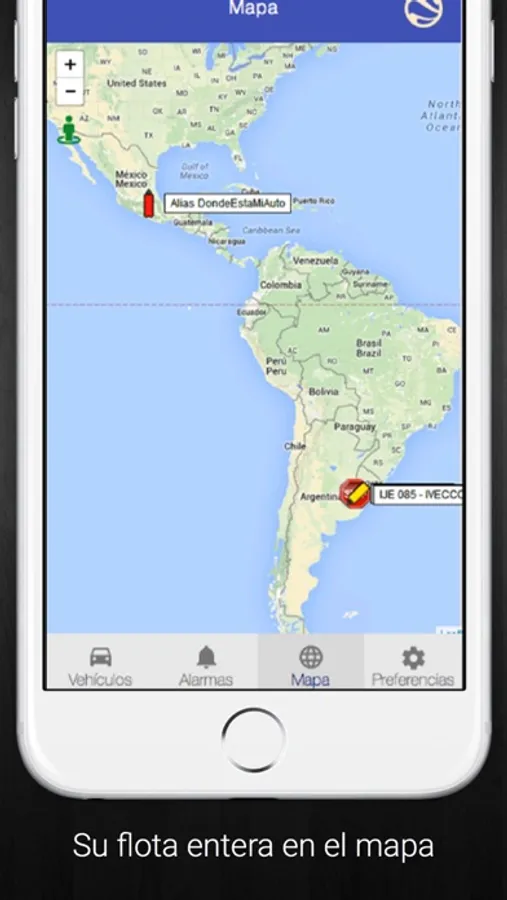 Vea en un mapa la ubicación de toda su flota, con vistas de mapa Standard, Imagen Satelital o Híbrido.