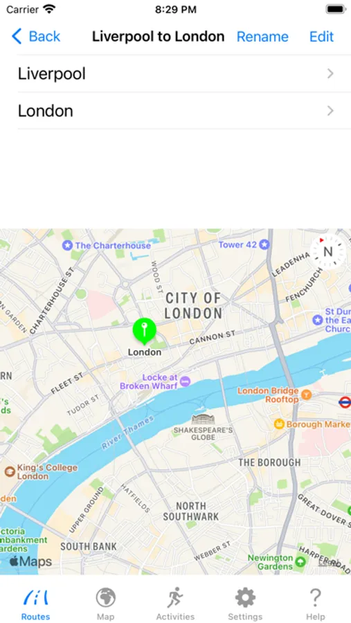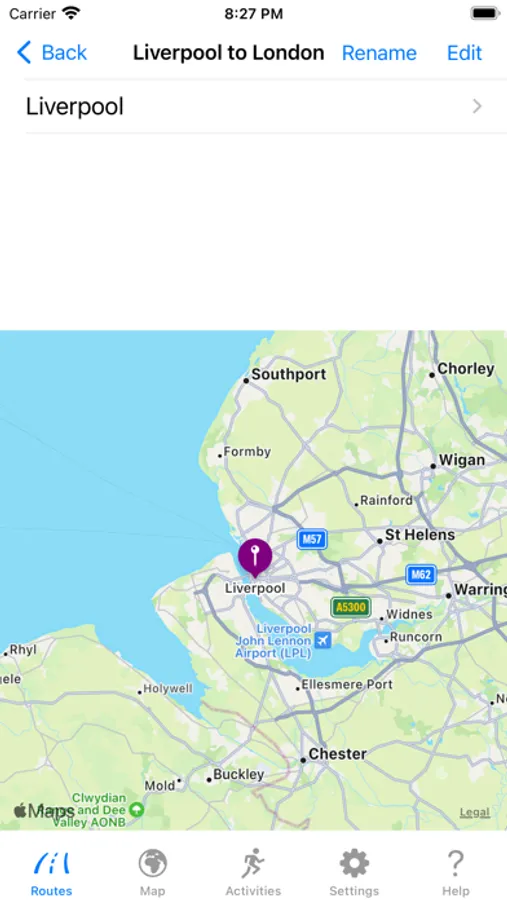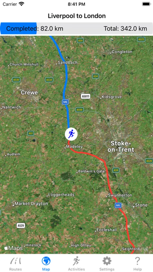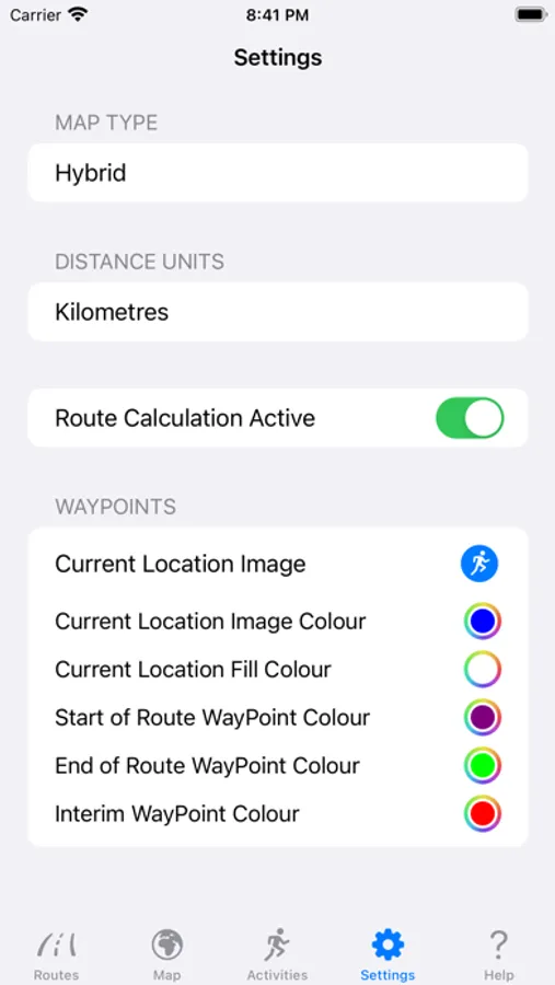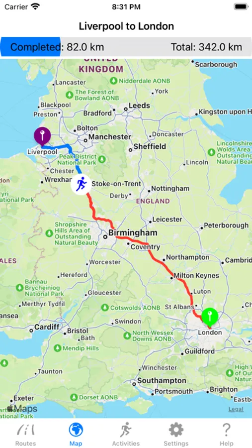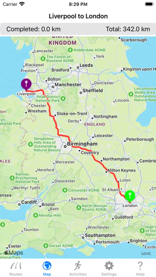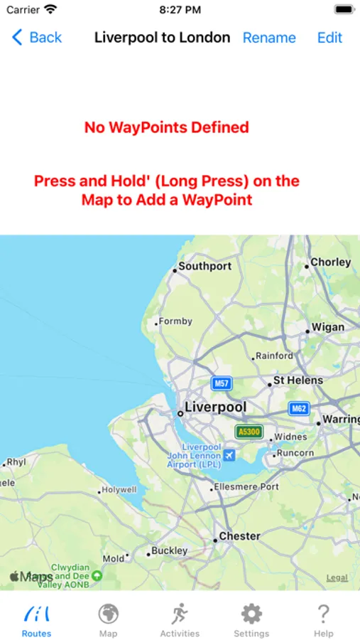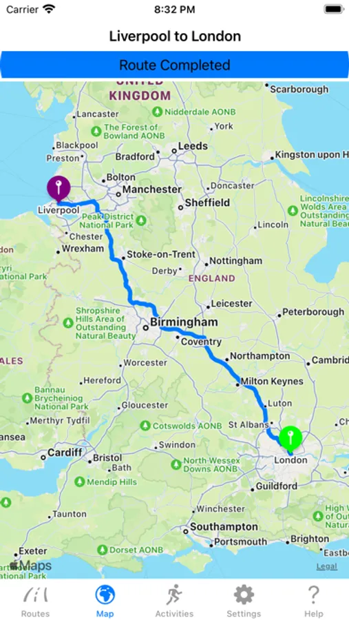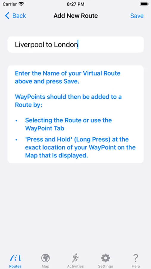 Virtual Run Bike & Hike allows you to select your starting position, your destination and a number of waypoints to visit en route. Go to the Map display and a route will be calculated and displayed for you.