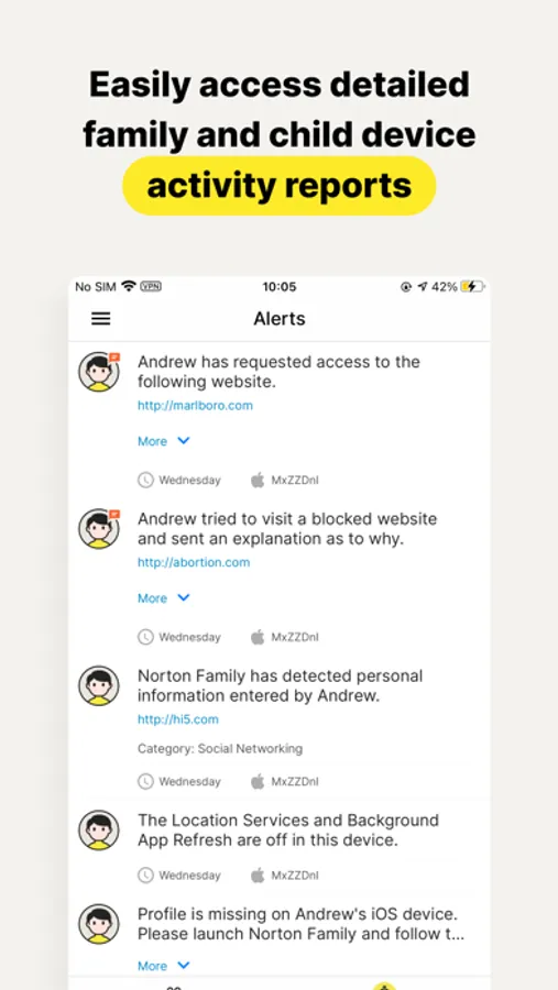 Access Request: Open the lines of communication by enabling your kids to send you a note from within Norton Family if they disagree with a blocked site or a house rule.