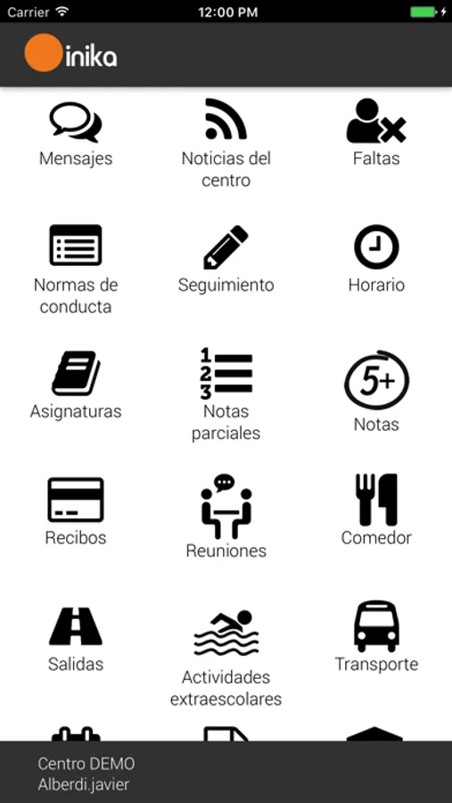 Cuando abras la App podrás elegir el Centro para iniciar sesión. Debes introducir el mismo usuario y contraseña que usas en la web de eInika.