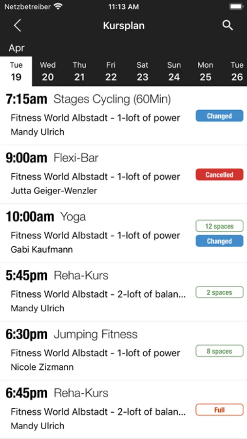 Direkter und aktueller Zugriff auf den Gruppentrainingsplan: Für jeden Kurs können Sie Details wie Zeit, Kursbeschreibung und leitender Trainer einsehen.