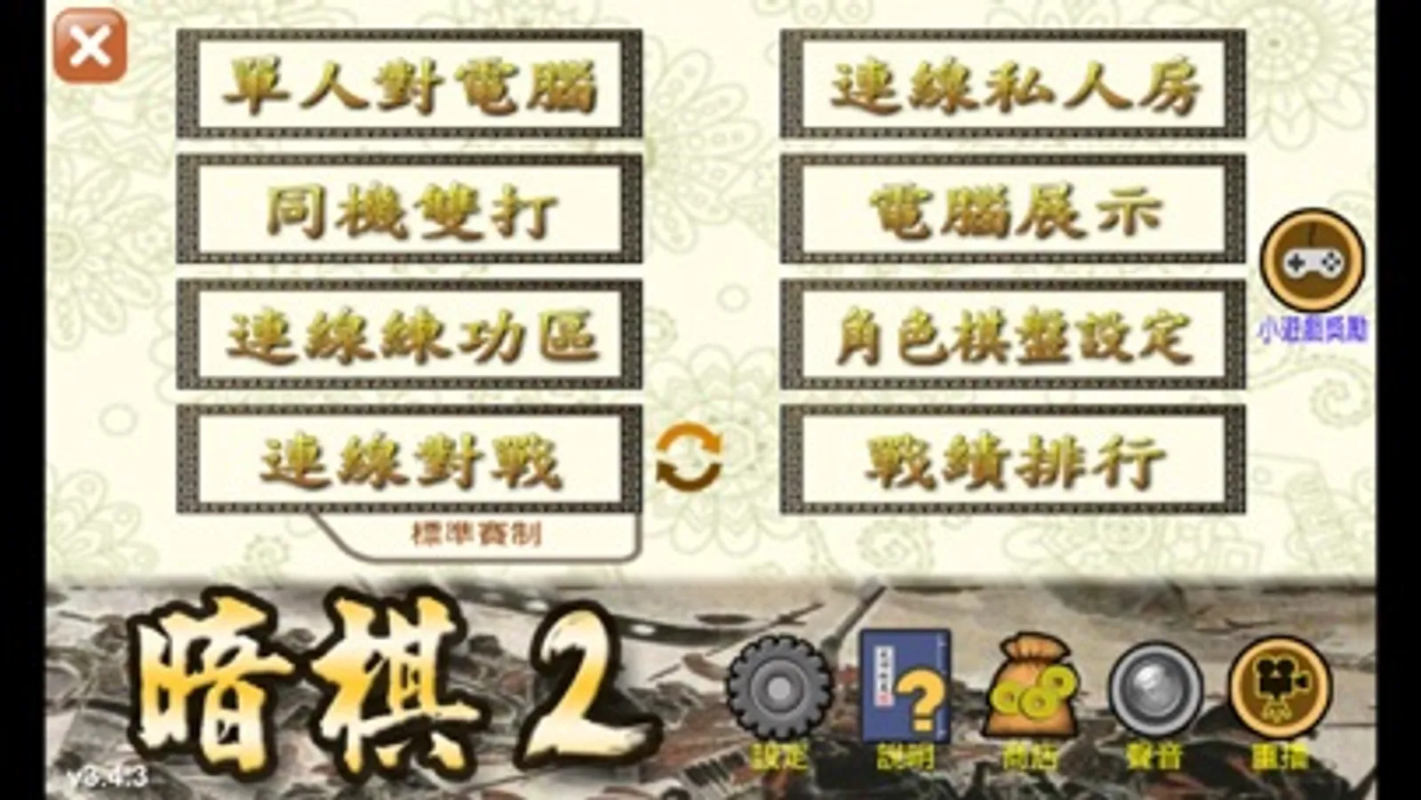 暗棋2全新功能再進化,新增wifi連線對戰(隨機配對),好友連線私人房功能,戰績排行榜,角色頭盔設定,多種樣式棋子棋盤選擇。