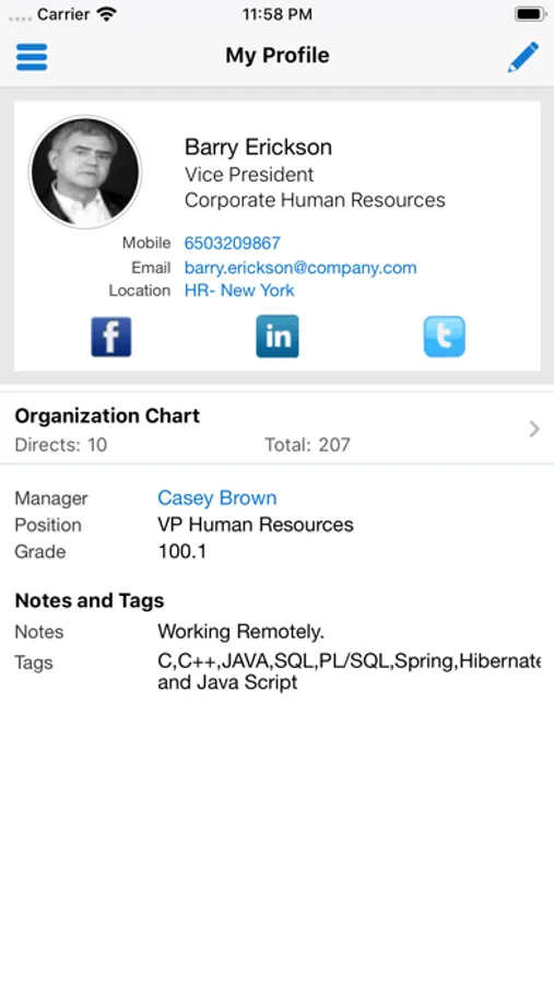 - Edit profile information such as the photo, mobile phone numbers, social media information, notes, and tags