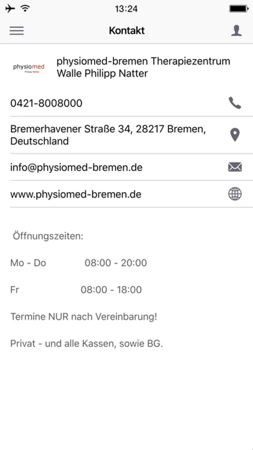 Holen Sie sich unsere offizielle Physiomed Bremen-App! Informieren Sie sich mobil über unsere Dienstleistungen und stehen Sie immer in direktem Kontakt zu uns. Sie sind mobil - und wir sind es ab sofort für Sie auch!