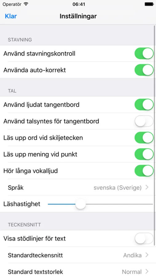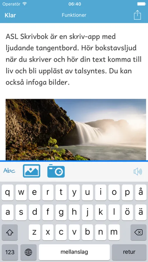 The WTR Notebook App provides many possibilities for teachers and parents to adapt the contents of the app such as spell check, autocorrect, language, and speech synthesizer. The app contains no in-app purchases, rewards, music or sound effects. The sounding keyboard supports Swedish and English, whilst the sound synthesizer can be used with any language supported by Apple.