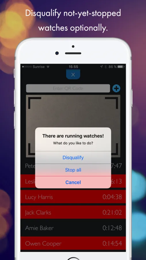 1) SINGLE START: Use this clever app for the timekeeping of various persons, starting at different times. Simply hold the QR code in front of the scanner. The app will then automatically generate your name and a new individual stopwatch will be started. If you scan the code again, the timer stops. It’s also possible to resume the same watch again.
