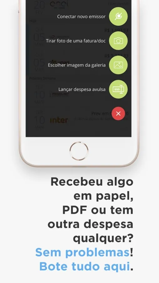 ◉ Recebeu uma fatura em papel ou PDF? Sem problemas. Você adiciona que a gente vai tentar detectar tudo, inclusive o código de barras para ser simples e rápido