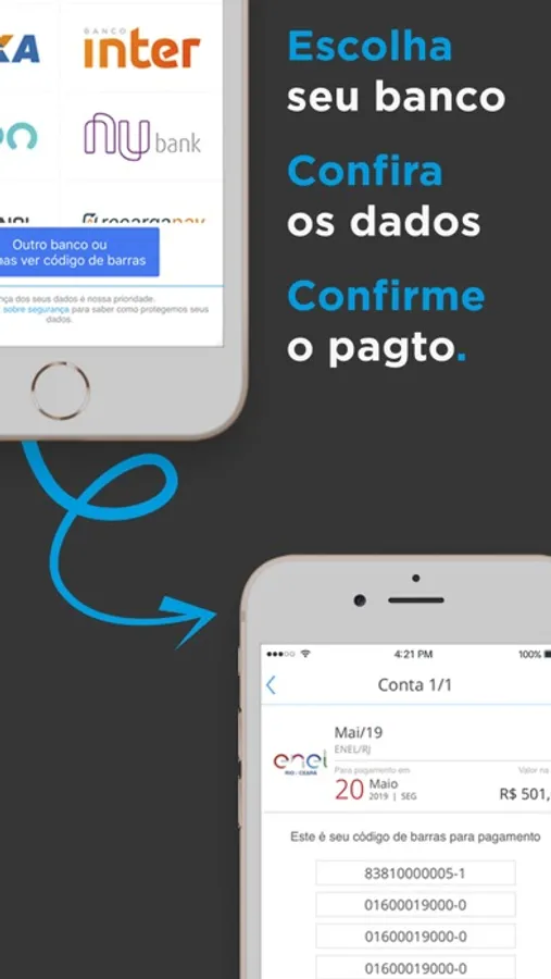 ◉ Digitar código de barras para pagar seus boletos? Esqueça isso e deixe com a gente. Temos interação com os principais apps dos bancos para você não ter que digitar nada. Aqui, tudo é mais fácil