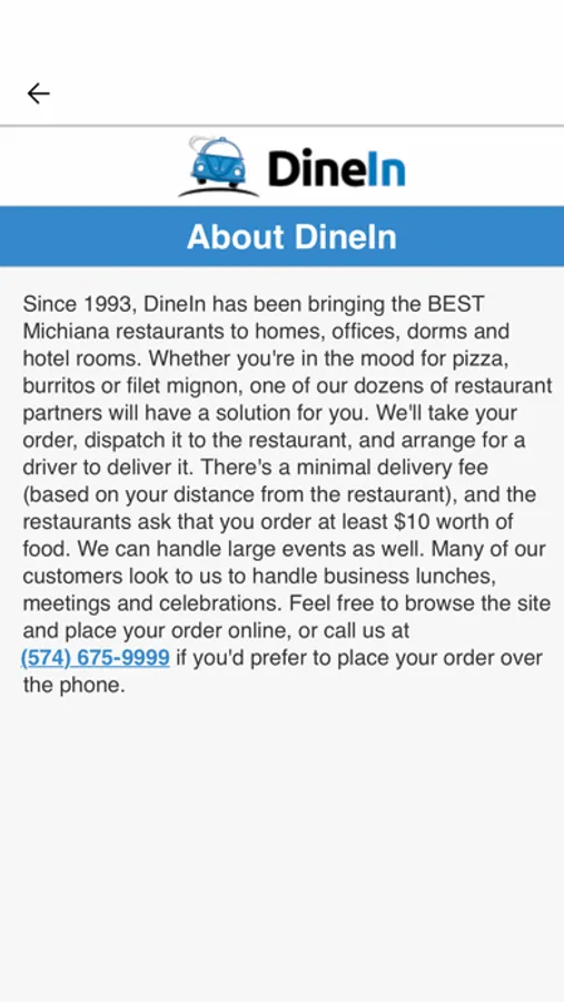 Since 1993, DineIn has been bringing the BEST Michiana restaurants to homes, offices, dorms and hotel rooms. Whether you're in the mood for pizza, burritos or filet mignon, one of our dozens of restaurant partners will have a solution for you. We'll take your order, dispatch it to the restaurant, and arrange for a driver to deliver it. There's a minimal delivery fee (based on your distance from the restaurant), and the restaurants ask that you order at least $10 worth of food. We can handle large events as well. Many of our customers look to us to handle business lunches, meetings and celebrations. Feel free to browse the site and place your order online, or call us at (574) 675-9999 if you'd prefer to place your order over the phone.