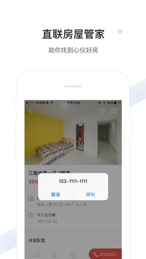 【急速找房】可通过输入关键词搜索、个性化快筛等方式灵活找房。电话联系房源管家,帮忙找房、带看、了解最新优惠活动等,助您分分钟找到心仪好房。