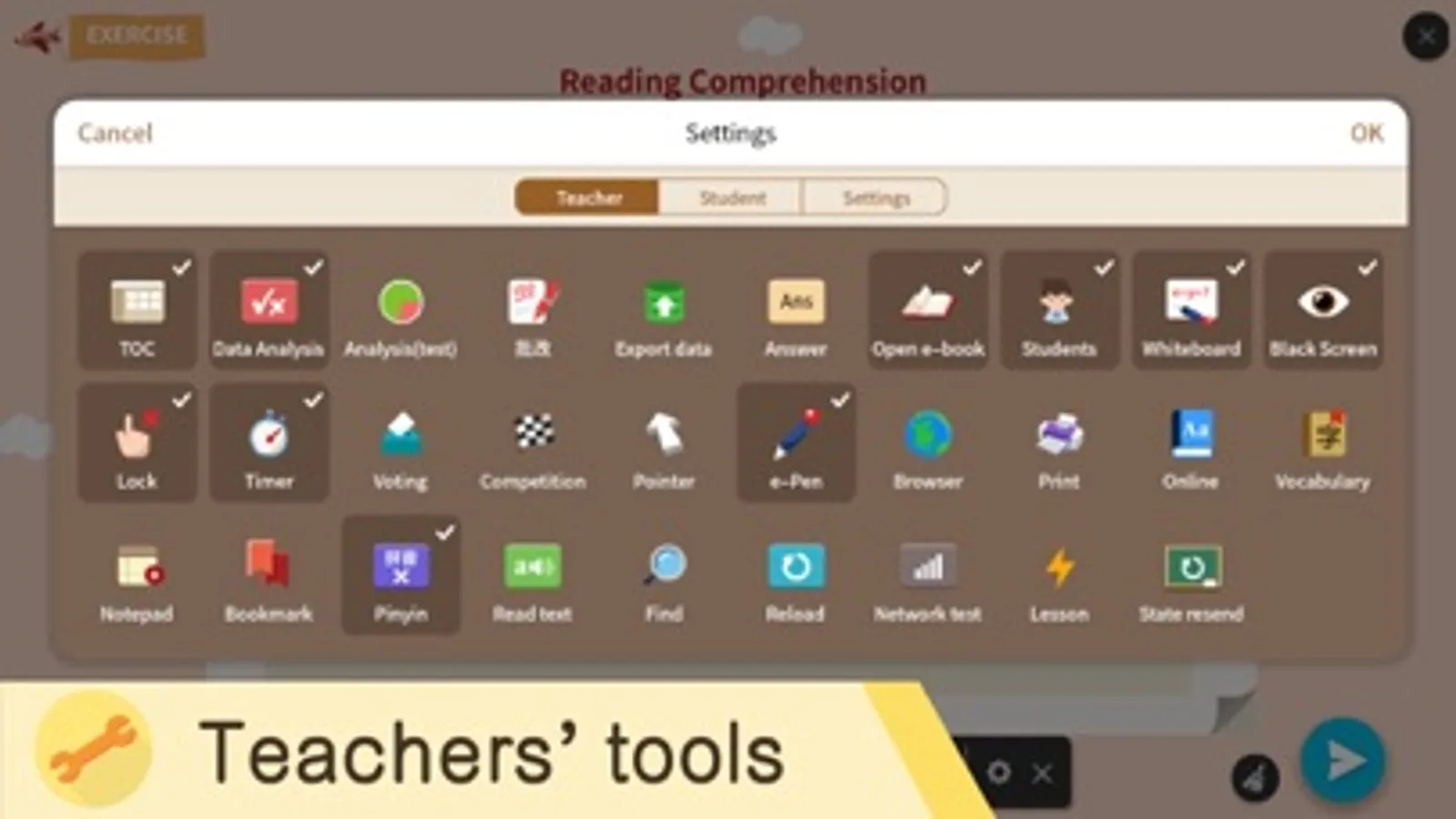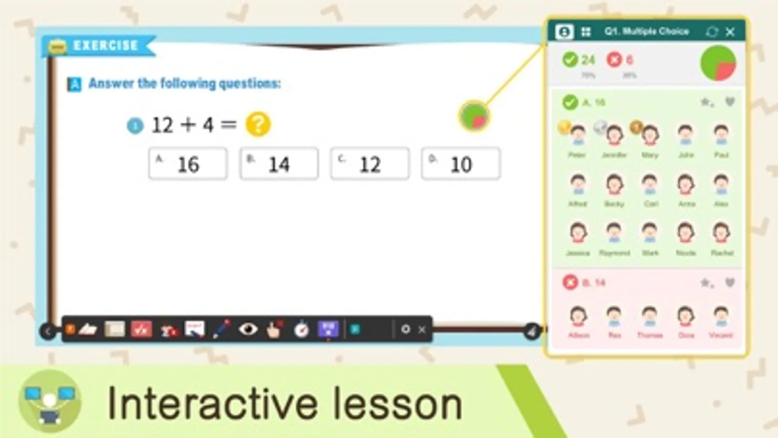 Lesson can be held in a cross-platform environment. You can group your students and hold a competition, voting or discussion. We also provide page-sync, black-out screen and other functions that helps you manage your class.