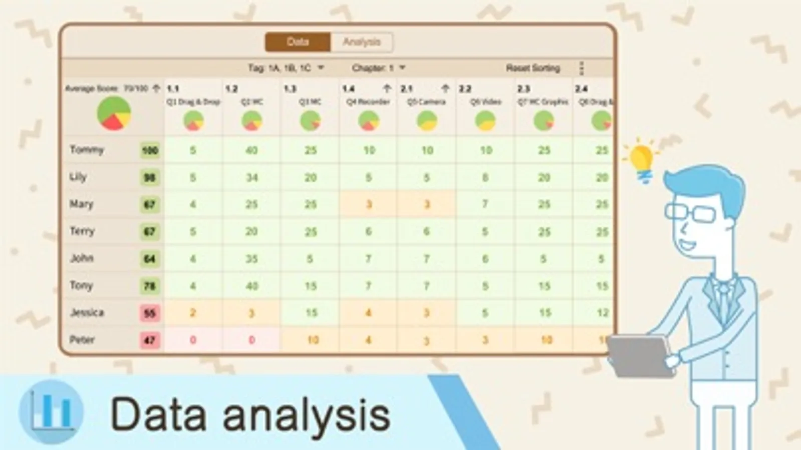 All questions with pre-set answers are instantly corrected. Learning data are automatically collected and analyzed. You can easily find out the learning difficulties of your students.
