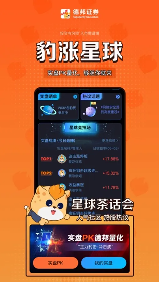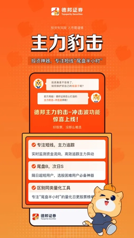 德邦证券APP致力于打造券商行业使用体验TOP1的证券交易APP!投资顾问全天候直播解读股票市场机会,就市论势、股市热点情报、短线策略、中长期布局机会;同时多种活动轮番上线,惊喜不断!N多投资策略分享,帮助投资者灵活应对市场变化,稳中求进,理性投资!