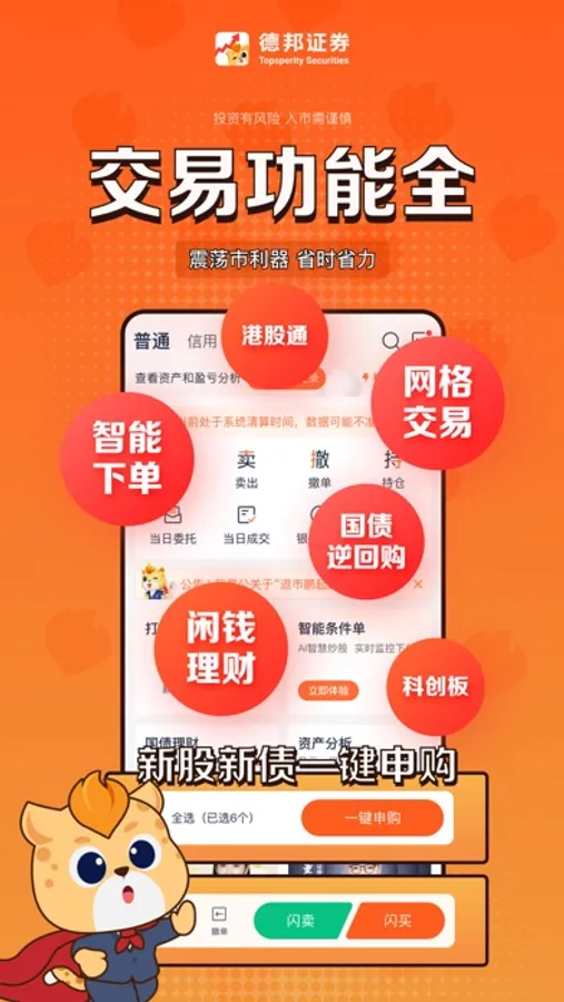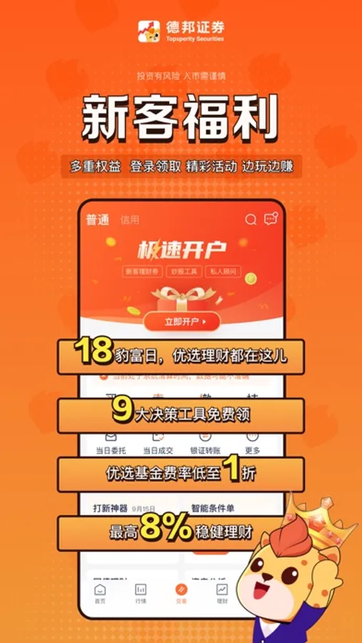 德邦证券线上3分钟线上光速开户,集敏捷、智能于一身,集行情交易、公募基金申购、理财产品购买、投顾投教、7X24小时实时快讯等产品、一键智能打新等功能于一体,是高效、智能化的投资平台,投资者业务全程线上办理,足不出户,一站投资!