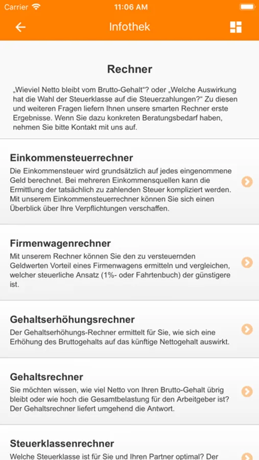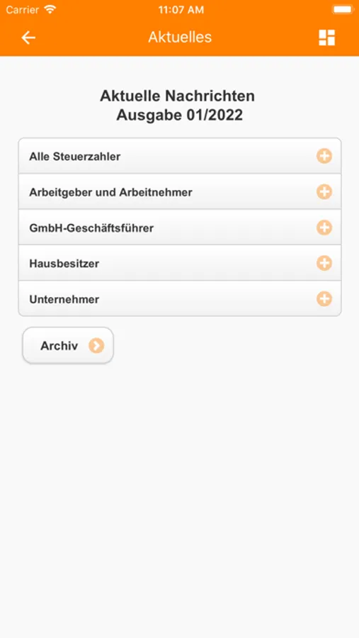 Die App liefert Ihnen monatlich steuerrechtliche Fachinformationen, hält Sie über fällige Steuerzahlungstermine auf dem Laufenden und bietet hilfreiche Antworten zu ausgewählten steuerrechtlichen Fragestellungen zum jederzeitigen Nachschlagen.