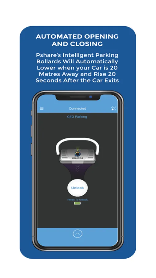 The most important tool to the brilliance of the Pshare parking bollards is the ability to control all features through our smartphone apps. Gone are the days where parking locks required a key or a remote control to open and close their devices. Now you can have the assured feeling that access to your parking lock is always stored on your smartphone.