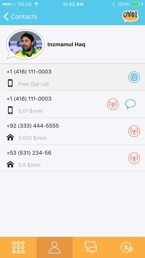 You own cellular number is your account with Oye USA; you get a passcode in SMS message or a phone call to authenticate you. Default calling method is Local Access, when you dial a phone number or choose one from your contacts; dialer attaches this number to a local number on our servers and dials that number. (Your Wifi/Data internet connection will be used for this local number setup). This local number automatically connects the call to the long distance number you originally dialed. If you have chosen “Callback” as calling method; when you dial a number or choose one from your contacts, dialer will send this number to our servers and our server will send you a call back on your phone number and connect this call to the number you originally dialed. Last but not the least is the “Internet” calling which makes the call using Wifi/Data internet connection without using allocated minutes from your provider. Internet dialing is also the best choice while you are roaming out from your provider’s coverage and have an internet connection available to you.