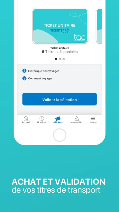 - Acheter et valider votre titre de transport sur le réseau de bus TAC (E-Tickets à l’unité ou en carnet de 10)
