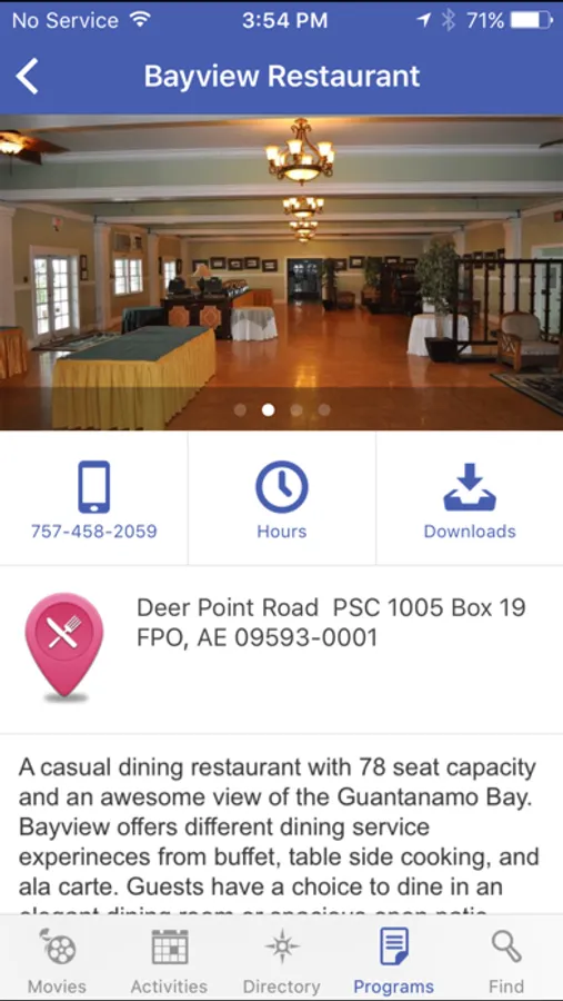View services, programs and activities for MWR Guantanamo Bay including hours of facilities, locations and GPS coordinates, description of services, and even call facilities directly from your phone. You can even browse for activities and classes. Find out what’s happening with current and upcoming events, local job announcements, notifications and alerts on special happenings, or MWR news.