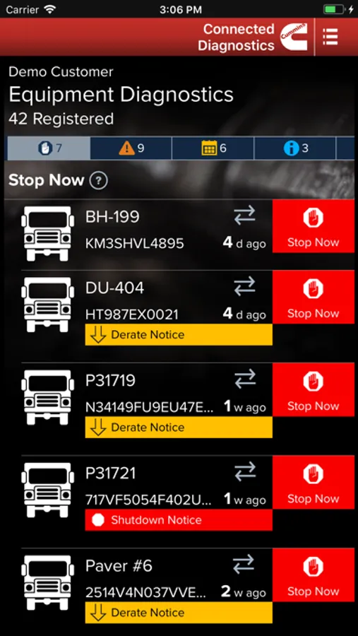 • Search functionality by VIN, ESN, Equipment ID, fault status or Cummins engine model.