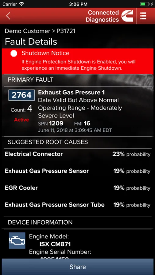 Connected Diagnostics™ uses the power of Cummins to analyze the fault code data, prioritizing all active and recently inactive faults to provide a high level of confidence that the recommendation to stop immediately or service immediately is the right one. Suggesting probable root cause of the fault to the component level, Connected Diagnostics™ facilitates the repair and minimizes downtime.