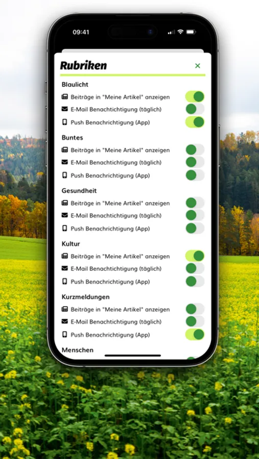Sobald du angemeldet bist, kannst du in deinem Profil die Themen oder Orte auswählen, für die du Nachrichten und Push-Benachrichtigungen erhalten willst. Zum Beispiel: „Blaulicht“ für alle Polizeimeldungen oder „Weiden“ für alle News aus Weiden.