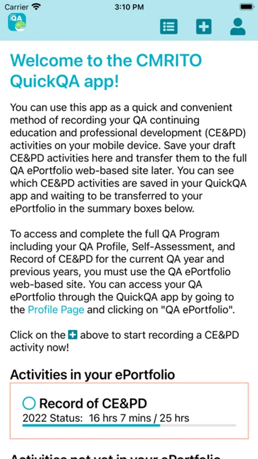 The CMRITO QuickQA app lets members document continuing education and professional development activities anytime, anywhere, online or offline. They can save their draft CE&PD activities on the app and transfer them to the full QA ePortfolio web-based site later. It is a free download and there is no service fee.