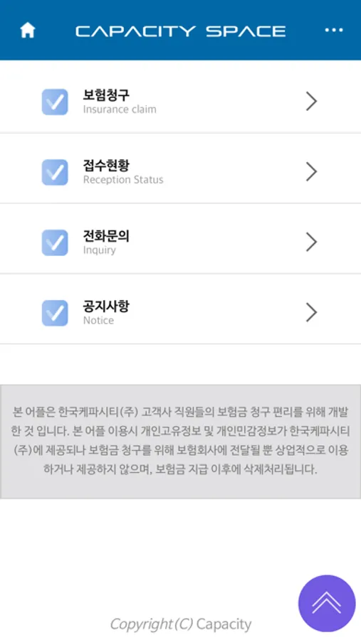 상세설명 : 한국케파시티(주)에 단체상해보험을 가입한 임직원들이 보험금 청구서류를 간편하게 접수하게끔 만든 애플리케이션입니다.