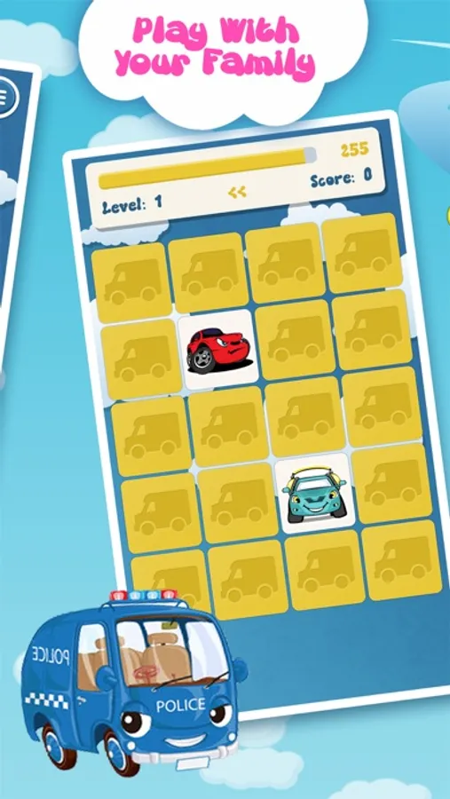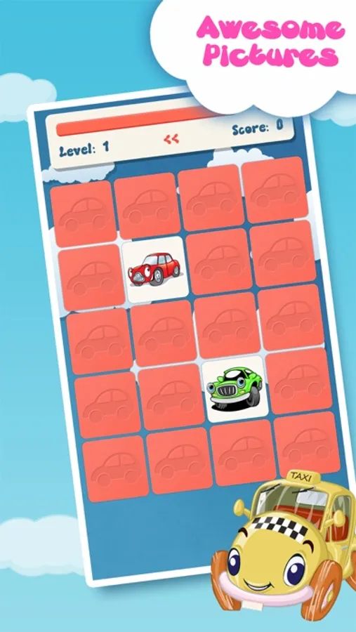 - For each level, player is required to tap the square buttons and need to memorize what is behind it in order to match its couple. Players are required to complete a level in minimum finger taps to match all cars.