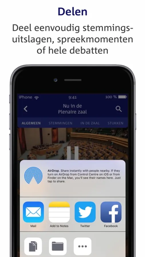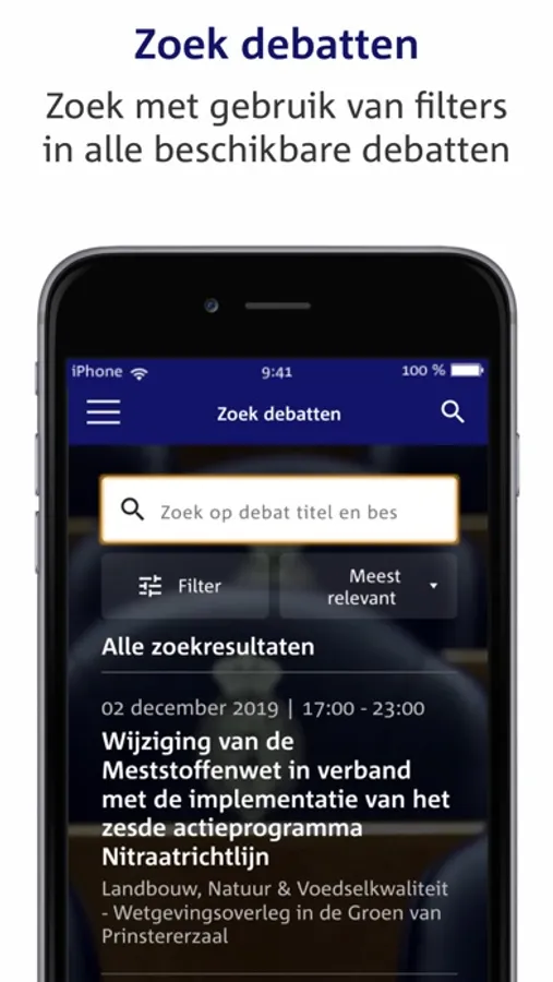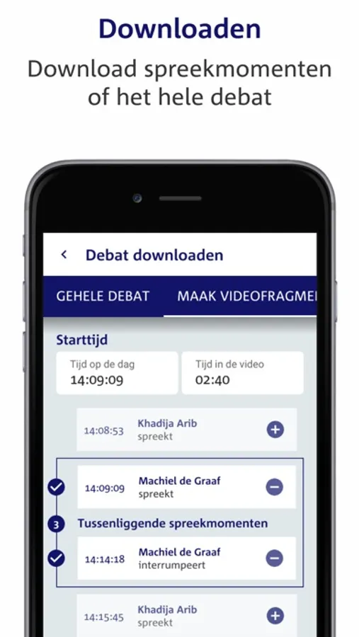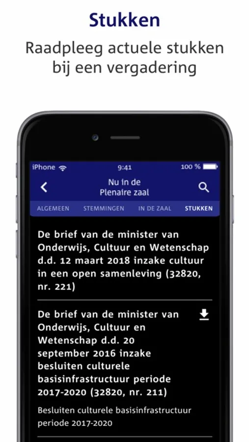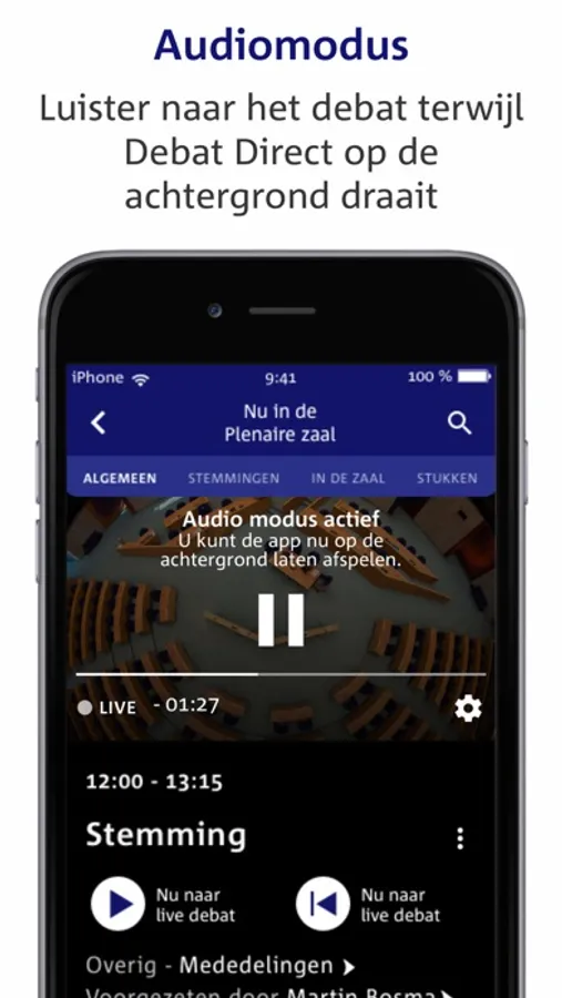 Debat Direct provides you with an introduction to the debate, tells you who is speaking, who else is expected to speak and which documents are relevant to the debate. Draft motions can be read and information about the MPs involved is easily accessible. You can also activate several notifications. If you do so, the app will send you a message when a debate starts, when a certain topic is up for discussion or when a specific politician is given the floor.