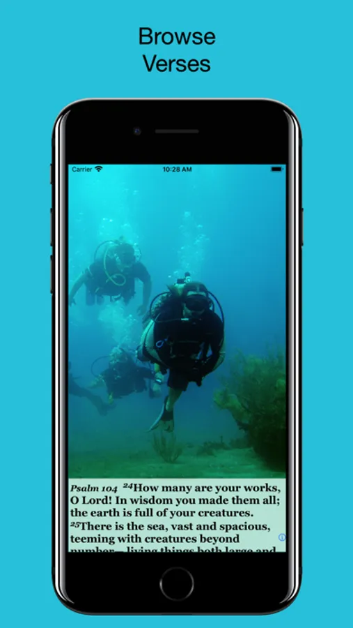 Easy to use! The simplicity of Psalm Daily Quotes allows you to focus on the words of scripture without distraction. The day's verse is displayed upon launch. Scroll up for longer verses. For browsing the collection of 365 images and verses, touch mid-right to advance one day. Touch mid-left to go back one day. Touch top of image for random verse. Touch "i" for help and other features such as sharing via Facebook or email.