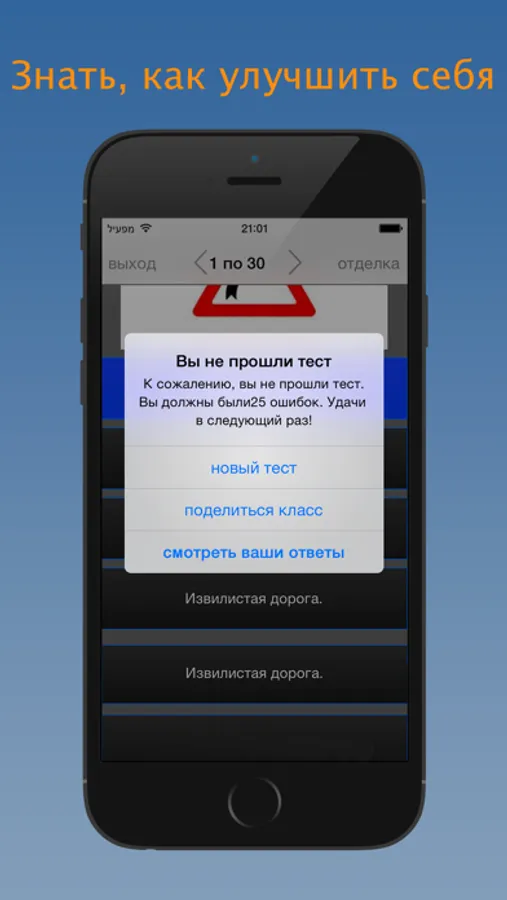 Режим имитирует реальный тест теории точно. В зависимости от типа лицензии вы выбираете, вы будете создавать демо тест приложение содержит 30 вопросов, которые будут заданы ответить в течение 40 минут. После того как вы ответить на все вопросы и нажмите кнопку тестирования на финише или время заканчивается, приложение будет сказать вам ли прошло вы или не прошли тест, и некоторые ошибки были вы, и где именно, и, следовательно, правильные ответы, в которых вы сделали ошибку. Эта ситуация настоятельно рекомендуется, чтобы проверить себя, прежде чем подойти к реальной экзамен по теории, чтобы проверить, насколько вы готовы, чтобы действительно поставлен на испытания.