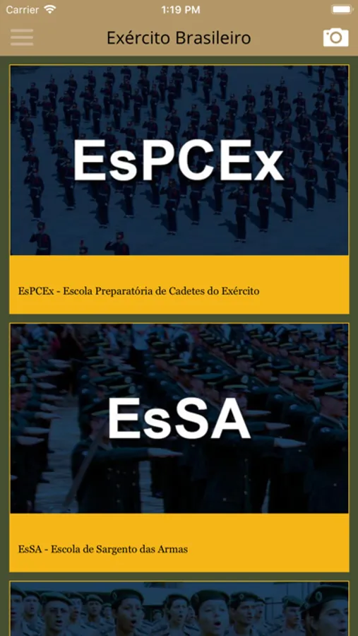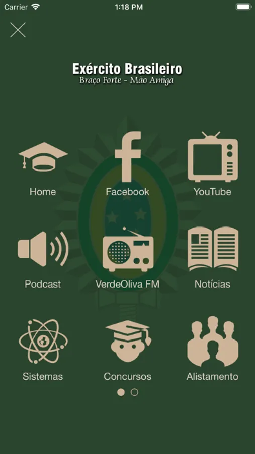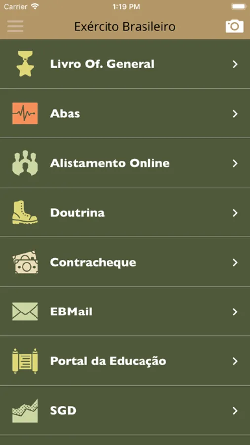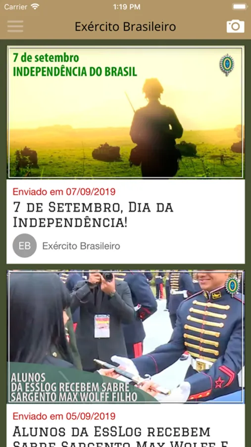 Aplicativo oficial do Exército Brasileiro, com links para as principais notícias e serviços. Nessa versão, os seguintes conteúdos estão disponíveis: Facebook, Youtube, Twitter, Podcast, Rádio VO, EBlog, Noticiário do Exército, Resenha, EB em Revista, Informex, Boletim Exército, Contracheque, Saúde, DGP, Quartéis por Estado, Hotéis de Trânsito e Junte-se a nós.