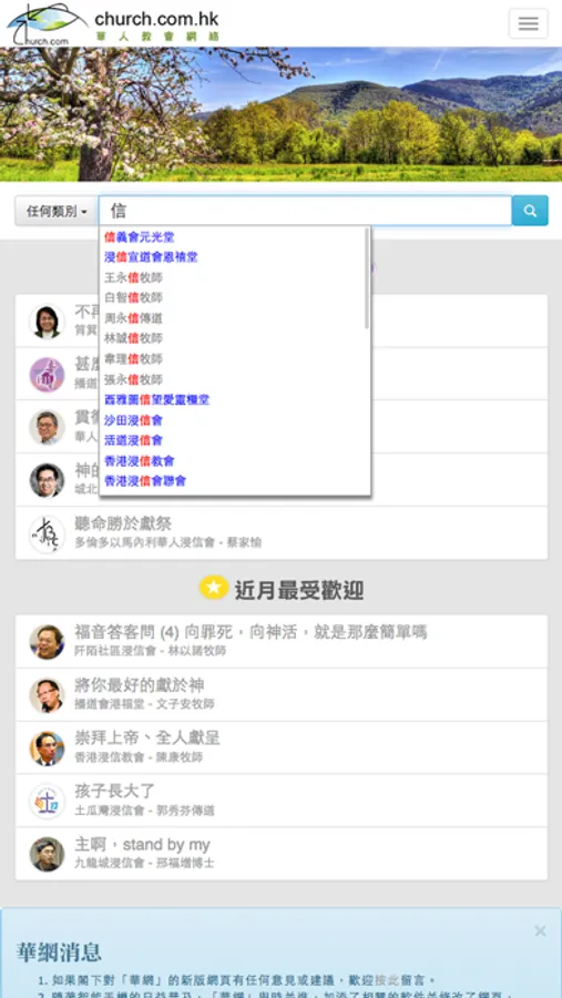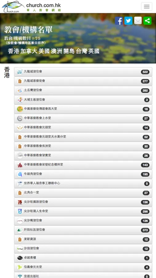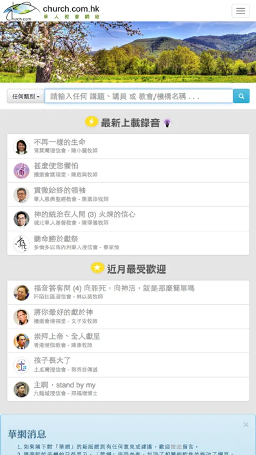 教會/機構:列出首二十間收藏最多錄音訊息的教會/機構,按「更多教會/機構...」可按所屬地區列出教會/機構索引。