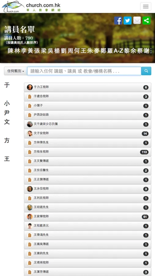 講員:列出首二十位收藏最多錄音訊息的講員,按「更多講員...」可按講員姓氏列出講員索引。