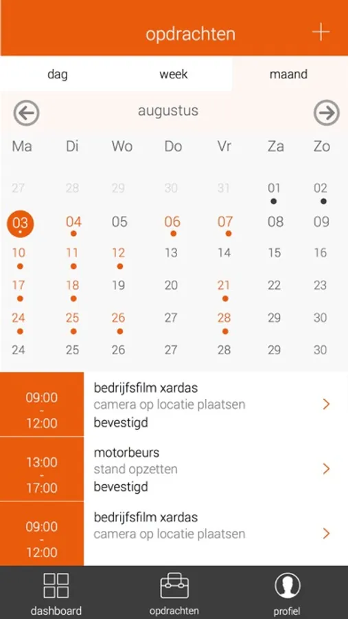 Door een koppeling met planningssoftware ziet de medewerker in TimeSnap al zijn ingeplande opdrachten/diensten. Hierin worden datum, tijden, project of dienstnaam, locatie, status en aanvullende opmerkingen getoond. De app kent een dag-, week- en maandweergave.