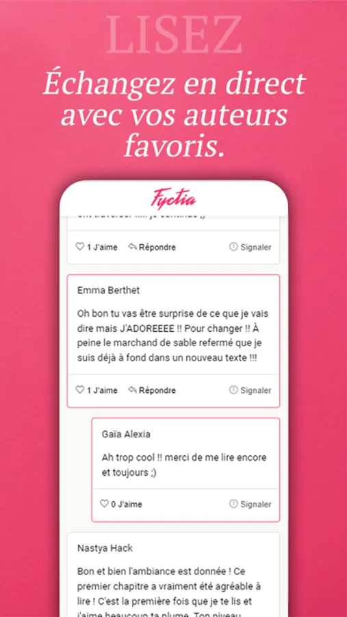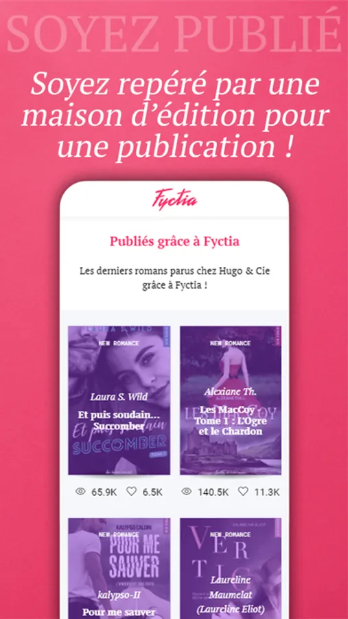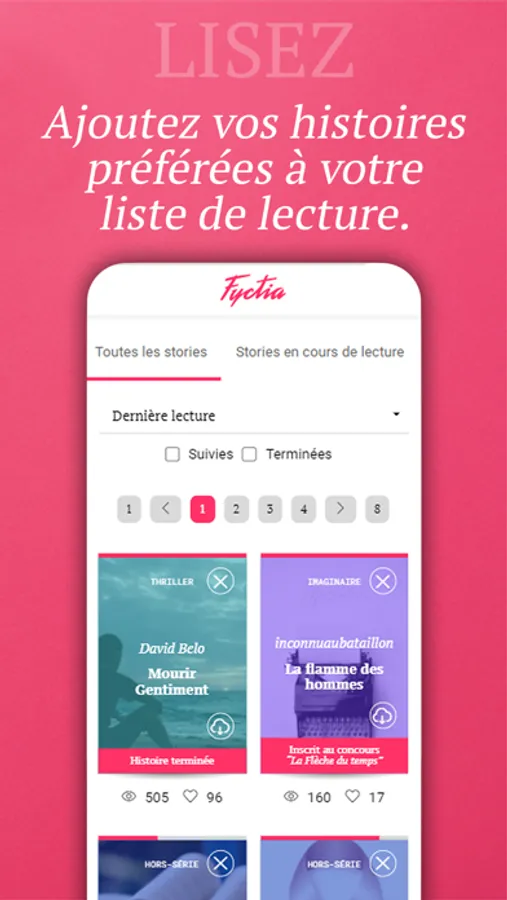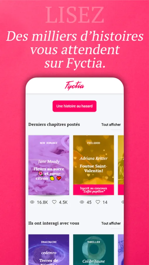 Sur Fyctia, plusieurs milliers d'histoires exclusivement en français vous attendent, dans votre genre favori : New Romance, Thriller, Imaginaire, Feel-Good... Repérez celles qui vous tentent grâce à notre onglet "Découverte" et ajoutez vos préférées à votre liste de lecture pour les retrouver facilement, où que vous soyez.