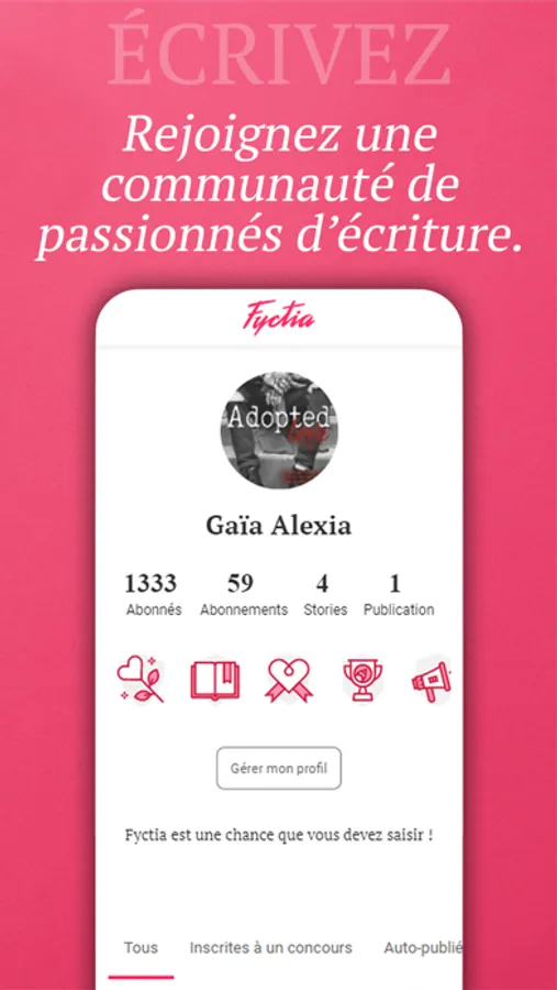 Bienvenue sur Fyctia, la plateforme d'écriture et de lecture qui vous permettra de découvrir des milliers d'histoires inédites, et de donner naissance aux vôtres !